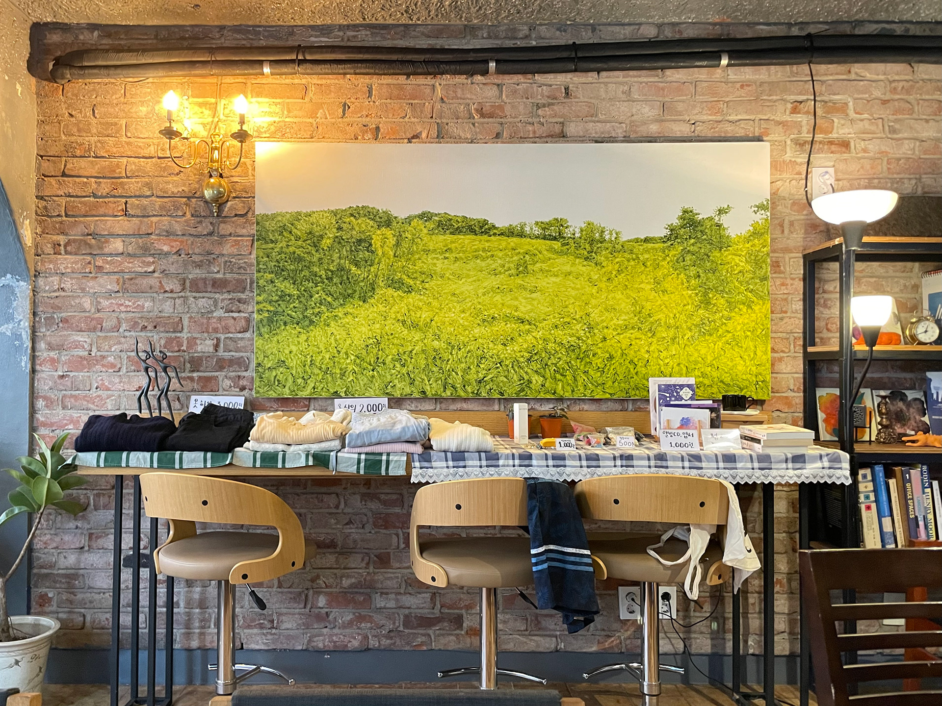 얇은 실로 의자를 다 감싸기엔 수고가 꽤 많이 들어갑니다. 그래도 시간을 들이니 점점 원하던 그림이 생겨납니다. ‘추운 의자에게 옷을 입혀주자’가 시작이었는데 어느 새 공간을 채우는 하나의 작품처럼 자라납니다. 옵옵제는 하루 이틀 짧게 열리지만 공을 들인 것들이 하나씩 모아지는 듯 합니다.